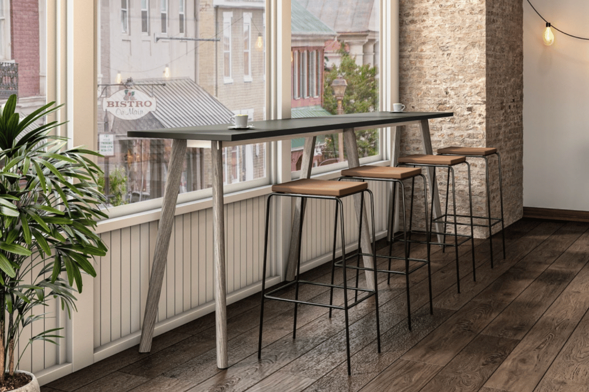 The Mason table collection features a signature cylindrical base and is offered in café and bar heights, with a steel foot rail standard on bar height for added comfort and stability.